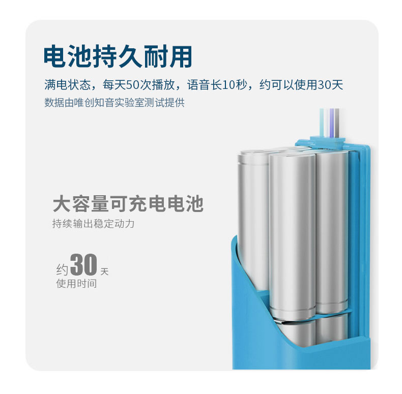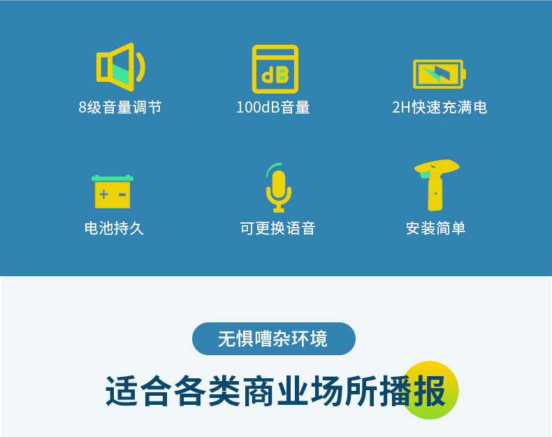 設(shè)備配備大容量鋰電池,支持2小時(shí)快速充滿(mǎn),續(xù)航長(zhǎng)達(dá)30天,同時(shí)保留插電供電模式,滿(mǎn)足不同安裝需求。具備8級(jí)音量可調(diào)功能,可根據(jù)店鋪環(huán)境靈活設(shè)置,既確保語(yǔ)音清晰傳達(dá),又避免聲音干擾。工作溫度范圍-20℃~60℃,適應(yīng)各類(lèi)商業(yè)環(huán)境。