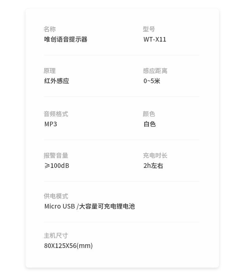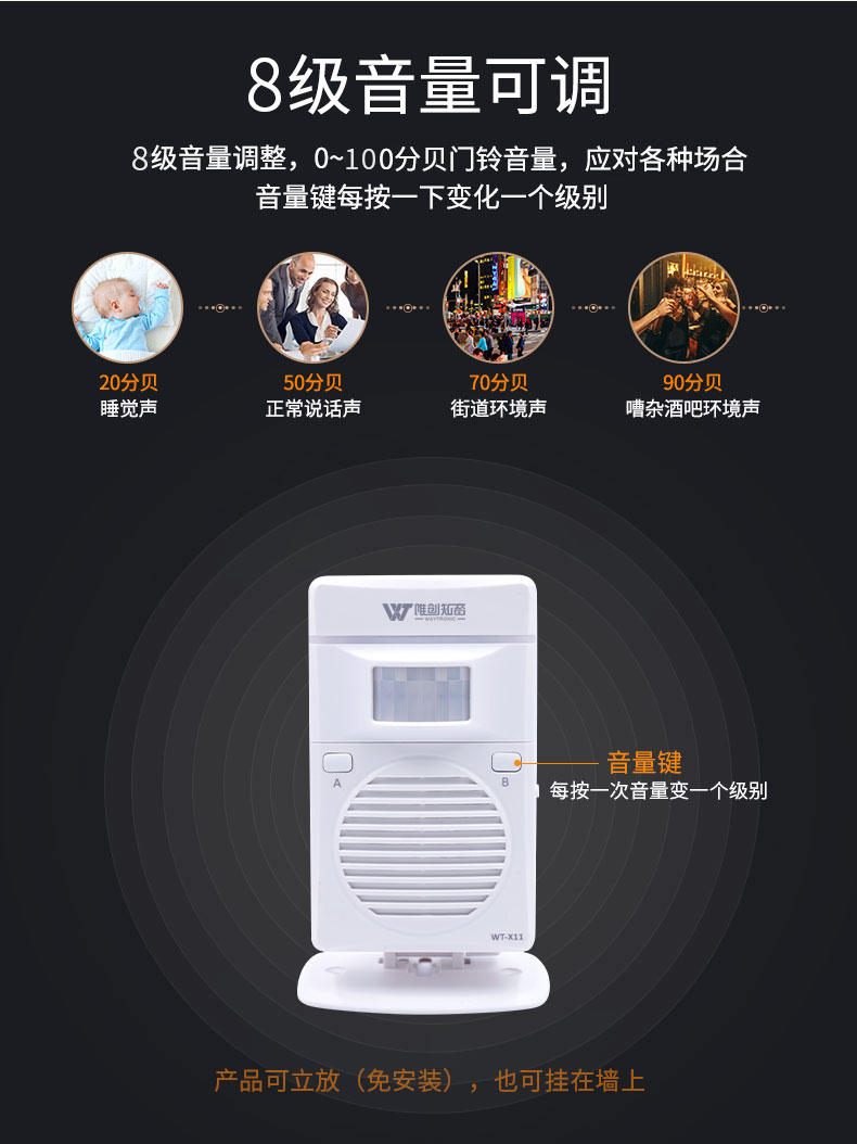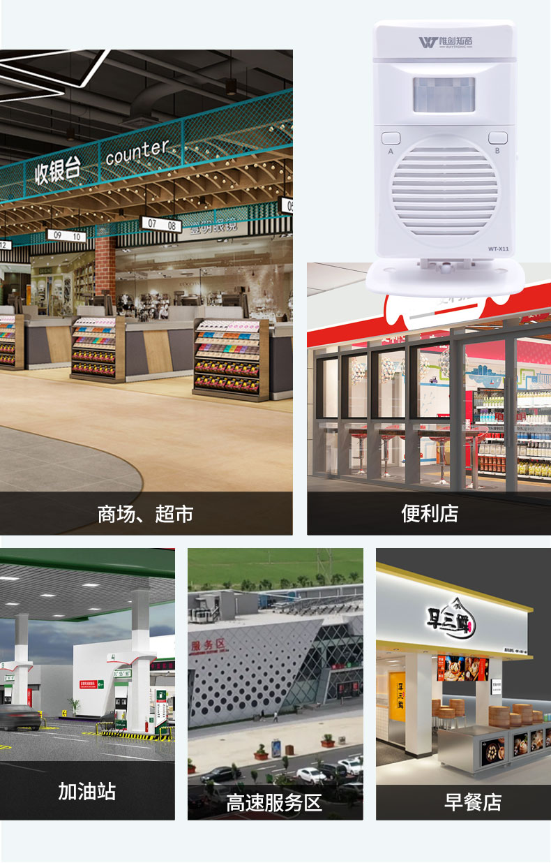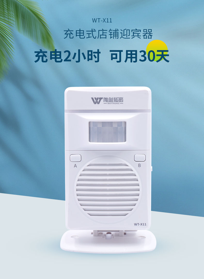 唯創(chuàng)知音WT-X11店鋪超市歡迎光臨迎賓器是一款專(zhuān)為零售場(chǎng)所設(shè)計(jì)的智能迎賓設(shè)備,適用于便利店、超市、商行等商業(yè)空間。產(chǎn)品采用靈敏的紅外感應(yīng)技術(shù),探測(cè)距離達(dá)5米,當(dāng)顧客進(jìn)入店鋪時(shí),設(shè)備即刻啟動(dòng)語(yǔ)音播報(bào),以100分貝清晰音效傳遞"歡迎光臨"等親切問(wèn)候。