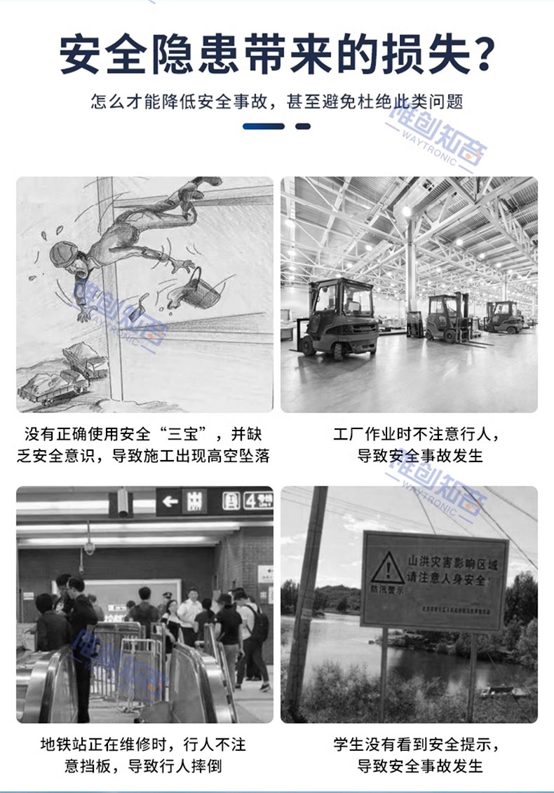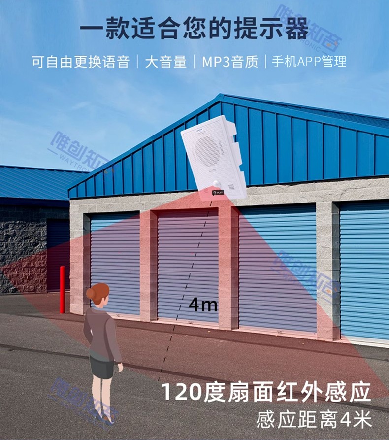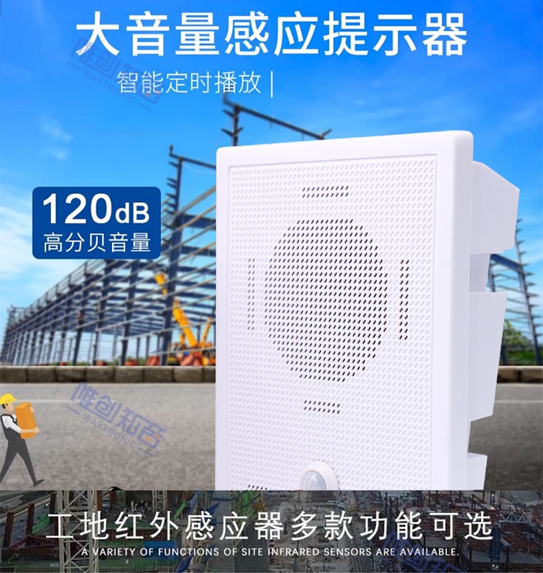 聲衛(wèi)示 WT-PS1A 工廠安全語(yǔ)音提示器,專(zhuān)為工廠入口、廠區(qū)車(chē)間、倉(cāng)庫(kù)重地等關(guān)鍵區(qū)域的安全管理設(shè)計(jì)。設(shè)備采用紅外感應(yīng)技術(shù)(感應(yīng)距離0-4米),精準(zhǔn)偵測(cè)人員進(jìn)入管控區(qū)域。觸發(fā)感應(yīng)后,設(shè)備立即啟動(dòng)高達(dá)120分貝的強(qiáng)響度語(yǔ)音警示播報(bào)(如“請(qǐng)佩戴防護(hù)裝備”、“注意機(jī)械運(yùn)行”、“倉(cāng)庫(kù)重地,禁止煙火”等),確保警示信息清晰可聞,即使在嘈雜工業(yè)環(huán)境中也能有效傳達(dá)。支持通過(guò)手機(jī)APP遠(yuǎn)程管理設(shè)備狀態(tài)及靈活更新語(yǔ)音內(nèi)容,實(shí)現(xiàn)警示策略的快速調(diào)整與集中管控。采用插電供電模式,穩(wěn)定可靠,適用于具備市電條件的固定點(diǎn)位部署??稍?20℃至60℃的寬溫環(huán)境下穩(wěn)定運(yùn)行,適應(yīng)廠區(qū)復(fù)雜環(huán)境需求。本設(shè)備集智能感應(yīng)、強(qiáng)聲警示與遠(yuǎn)程管理于一體,有效強(qiáng)化工廠關(guān)鍵區(qū)域的安全提醒,規(guī)范人員行為,顯著提升安全管理的時(shí)效性與靈活性,是構(gòu)建智能化廠區(qū)安防體系的高效工具。