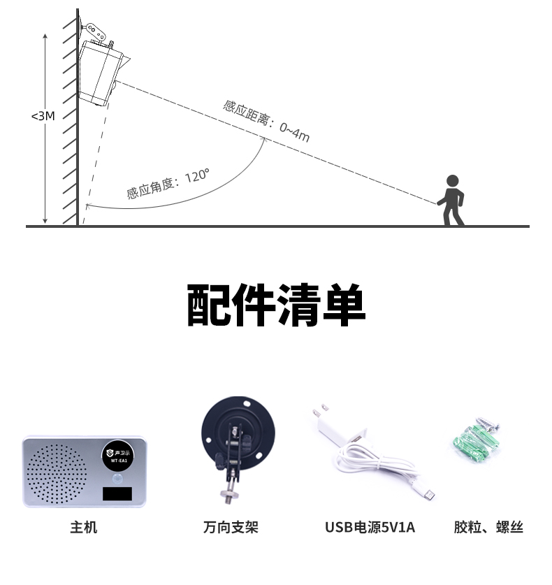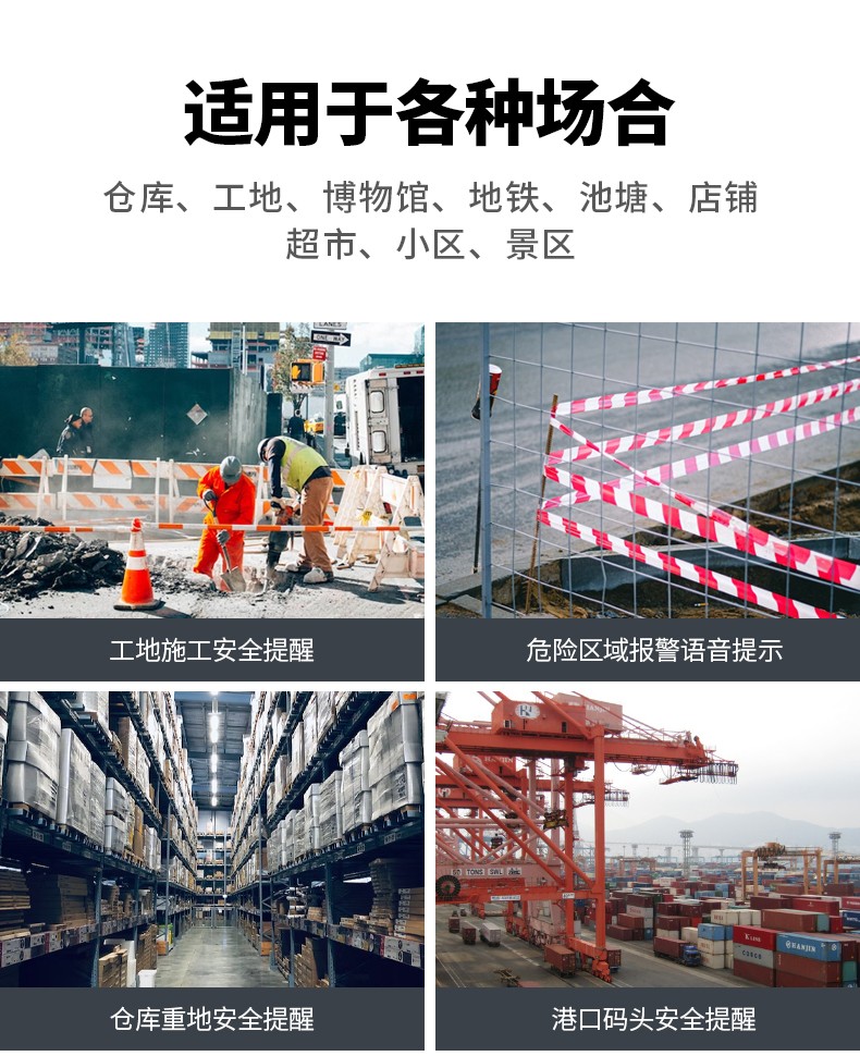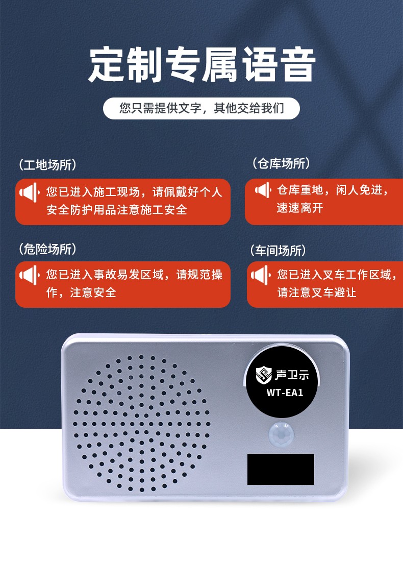 聲衛(wèi)示W(wǎng)T-EA1工廠安全語音提示器專為工廠入口、廠區(qū)車間、倉庫重地等關(guān)鍵區(qū)域的安全警示設(shè)計。設(shè)備采用紅外感應(yīng)技術(shù)(感應(yīng)距離0-4米),有效偵測人員進(jìn)入管控區(qū)域。觸發(fā)感應(yīng)后,設(shè)備立即啟動110分貝高響度語音警示播報(如“請佩戴防護(hù)裝備”、“注意機(jī)械運行”、“倉庫重地,嚴(yán)禁煙火”等),及時提醒人員遵守安全規(guī)范。支持通過手機(jī)APP進(jìn)行遠(yuǎn)程設(shè)備管理及自定義更新語音內(nèi)容,實現(xiàn)警示策略的靈活調(diào)整與集中控制。提供插電、充電與太陽能三模供電,部署靈活性強(qiáng),尤其適合無固定電源或需移動布設(shè)的區(qū)域。具備IPX5基礎(chǔ)防水防塵能力,可抵御車間常見粉塵及輕微液體潑濺,在-20℃至60℃寬溫環(huán)境下穩(wěn)定運行。本設(shè)備集智能感應(yīng)、語音警示、靈活供電與遠(yuǎn)程管理于一體,有效強(qiáng)化廠區(qū)關(guān)鍵點位的即時安全提醒,提升安全管理效率與響應(yīng)能力,是構(gòu)建現(xiàn)代化工廠智能安防體系的實用工具。