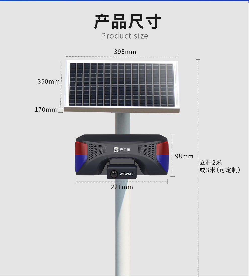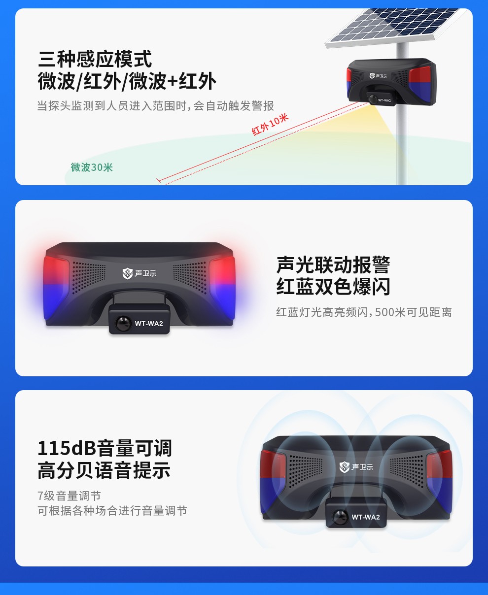 聲衛(wèi)示W(wǎng)T-WA2工地安全太陽(yáng)能語(yǔ)音宣傳桿,專為建筑工地、道路施工等作業(yè)區(qū)域的安全防護(hù)設(shè)計(jì)。設(shè)備搭載紅外/微波雙模感應(yīng)技術(shù)(紅外感應(yīng)8米,微波感應(yīng)10米),有效探測(cè)進(jìn)入危險(xiǎn)區(qū)域的人員與車(chē)輛。當(dāng)檢測(cè)到目標(biāo),設(shè)備即刻激活115分貝高響度語(yǔ)音警示播報(bào)(如“請(qǐng)佩戴安全帽”、“注意高空墜物”等)并啟動(dòng)強(qiáng)效聲光警示系統(tǒng),及時(shí)提醒現(xiàn)場(chǎng)人員規(guī)避風(fēng)險(xiǎn)。支持通過(guò)手機(jī)APP遠(yuǎn)程管理設(shè)備狀態(tài)及靈活更新定制化警示語(yǔ)音內(nèi)容,適應(yīng)不同施工階段的安全管理需求。提供插電、充電與太陽(yáng)能三模供電,確保各類工地環(huán)境(尤其無(wú)市電區(qū)域)的持續(xù)穩(wěn)定運(yùn)行。具備IPX5基礎(chǔ)防水防塵能力,可抵御工地常見(jiàn)雨水、粉塵侵襲,在-20℃至60℃寬溫條件下可靠工作。本設(shè)備集智能探測(cè)、可定制語(yǔ)音宣傳、聲光警示與遠(yuǎn)程管控于一體,顯著提升施工現(xiàn)場(chǎng)的安全預(yù)警能力與主動(dòng)管理效率,是構(gòu)建智慧化工地安全體系的重要設(shè)施。