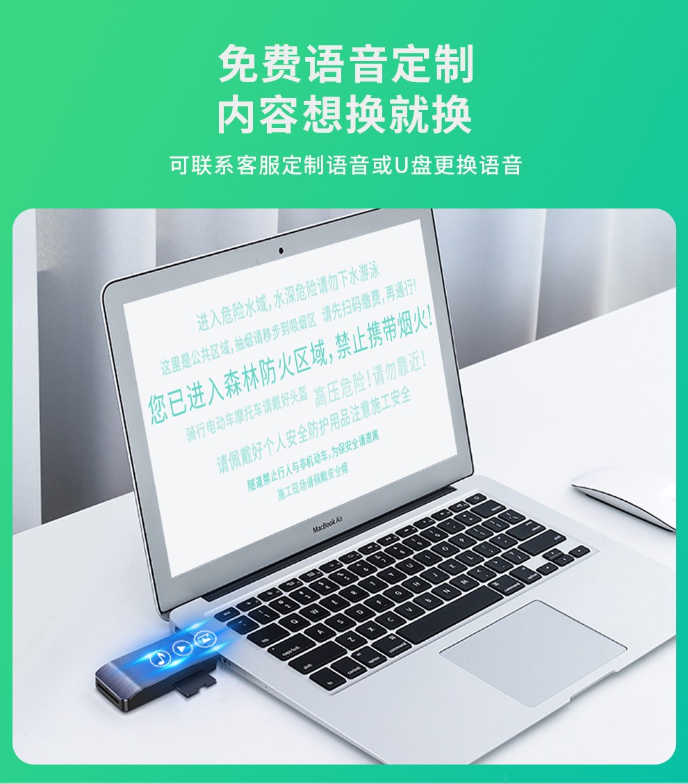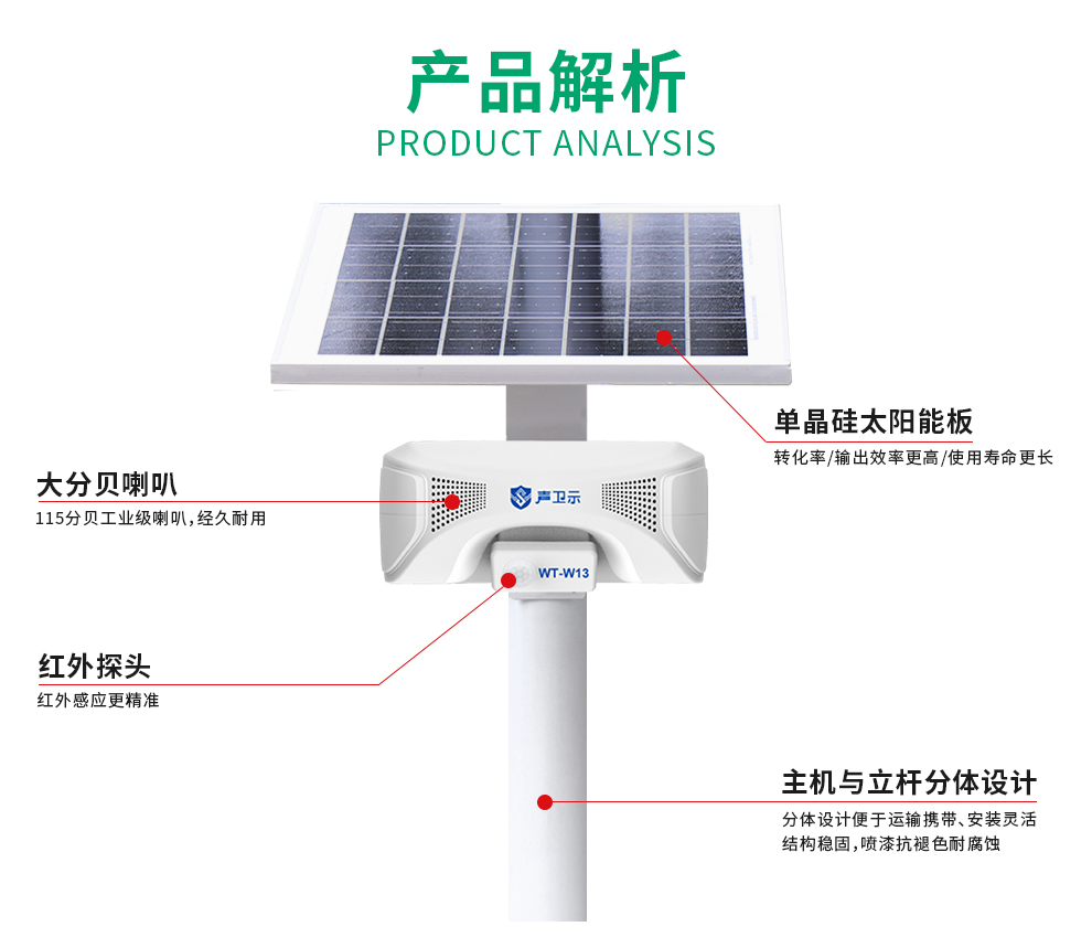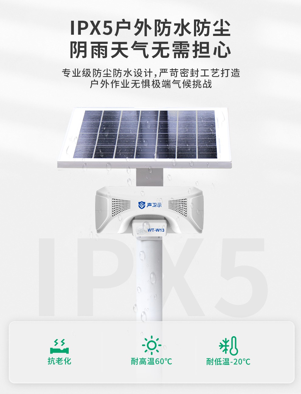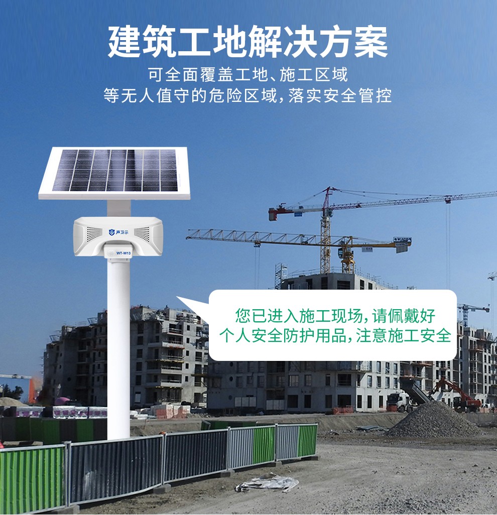 聲衛(wèi)示 WT-W13 工地安全語音宣傳桿,專為工地入口、施工區(qū)域等關(guān)鍵節(jié)點(diǎn)安全警示設(shè)計(jì)。設(shè)備采用紅外感應(yīng)技術(shù)(感應(yīng)距離0-8米),有效偵測進(jìn)入管控區(qū)域的人員與車輛。觸發(fā)感應(yīng)后,設(shè)備即刻啟動(dòng)115分貝高響度語音警示播報(bào)(如“請(qǐng)佩戴安全帽”、“當(dāng)心高空墜物”、“危險(xiǎn)區(qū)域,禁止入內(nèi)”等),清晰傳達(dá)安全指令,提醒現(xiàn)場人員規(guī)避風(fēng)險(xiǎn)。支持插電與太陽能雙模供電,部署靈活,既可利用市電穩(wěn)定運(yùn)行,也可通過太陽能保障無電源區(qū)域的持續(xù)工作。具備IPX5基礎(chǔ)防水防塵能力,可抵御工地常見雨水潑濺及揚(yáng)塵侵襲。在-20℃至60℃的寬溫環(huán)境下運(yùn)行可靠,適應(yīng)各類施工氣候條件。本設(shè)備集智能探測、強(qiáng)聲語音警示于一體,全天候值守工地關(guān)鍵點(diǎn)位,有效提升現(xiàn)場人員安全意識(shí),預(yù)防安全事故發(fā)生,是強(qiáng)化施工安全管理效能的實(shí)用裝備。