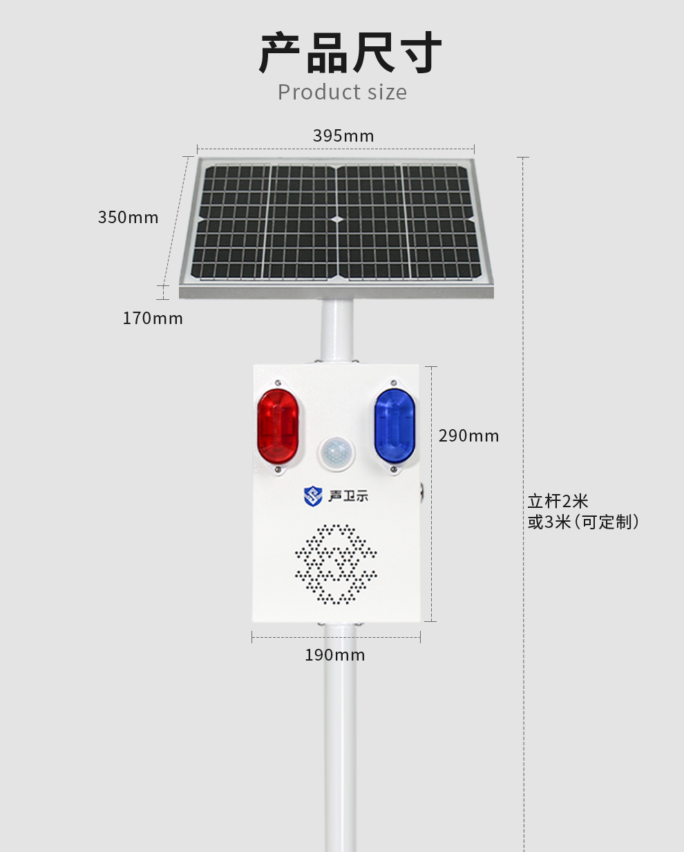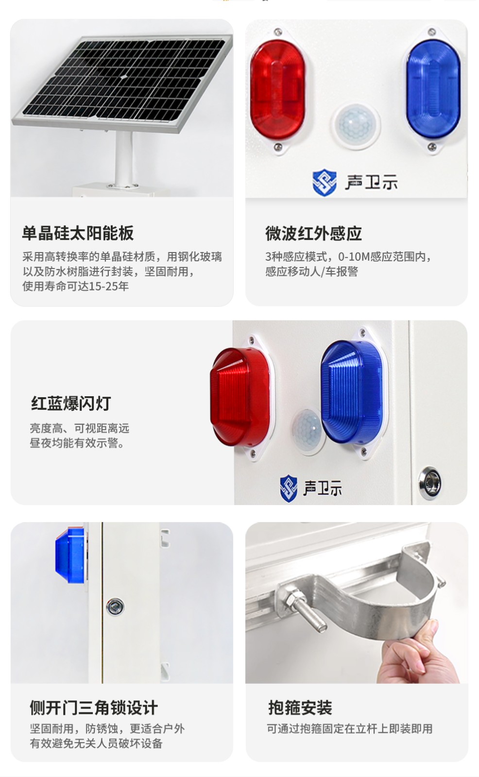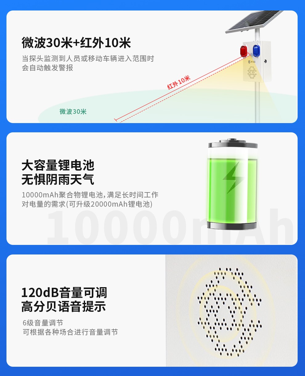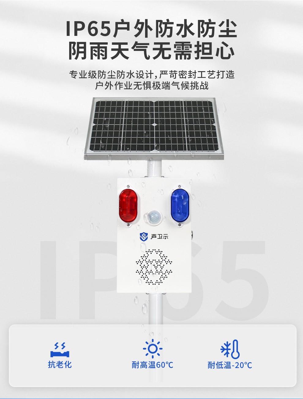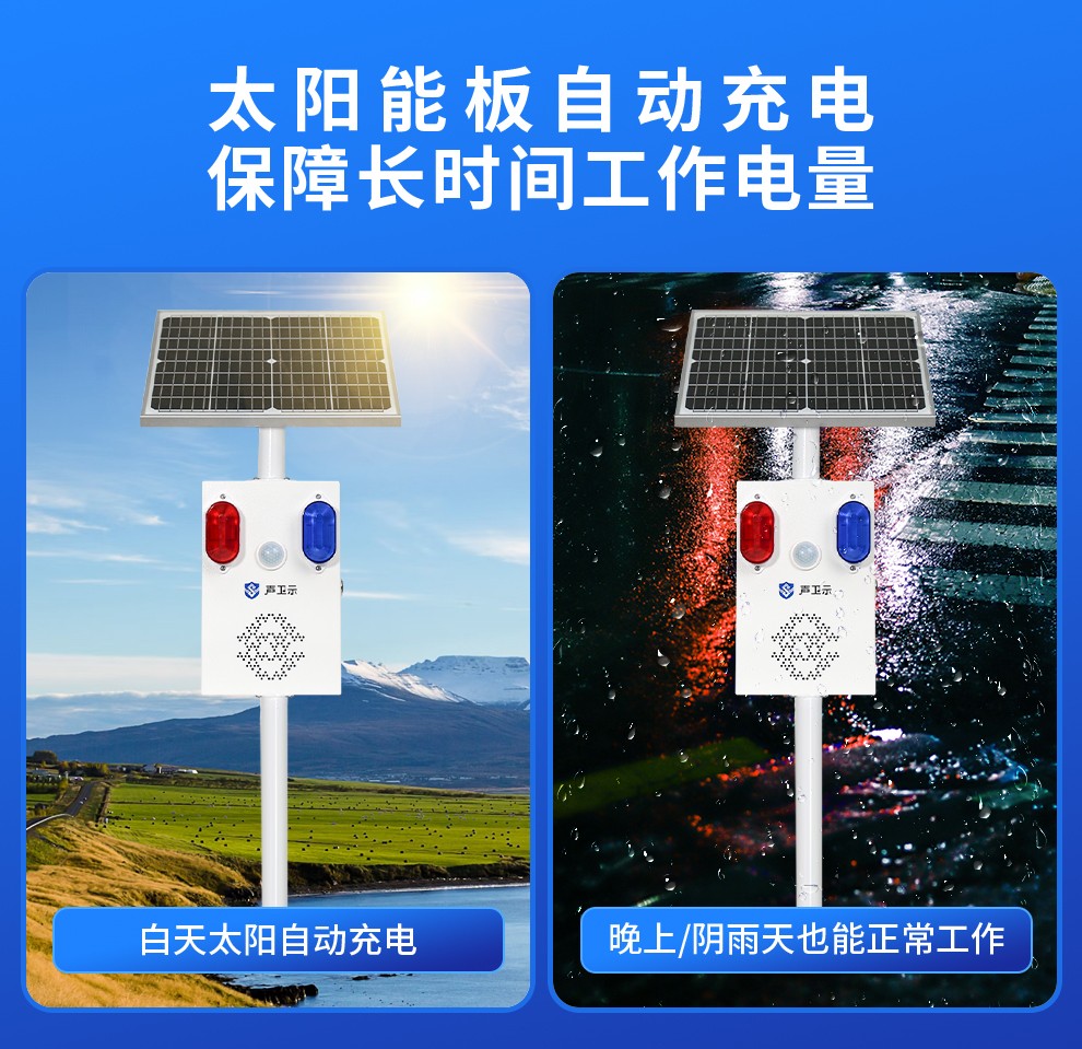 聲衛(wèi)示 WT-WS8A 交通安全太陽(yáng)能語(yǔ)音宣傳桿,專為城鄉(xiāng)道路、街道入口卡口、高速路口等關(guān)鍵交通節(jié)點(diǎn)設(shè)計(jì)。設(shè)備采用紅外+微波雙模感應(yīng)技術(shù)(紅外10米/微波30米),精準(zhǔn)探測(cè)車輛與行人通行。觸發(fā)感應(yīng)后,設(shè)備即刻啟動(dòng)高達(dá)120分貝的超強(qiáng)響度語(yǔ)音警示播報(bào)(如“請(qǐng)減速慢行”、“注意來(lái)車”、“禁止闖紅燈”等)并同步激活強(qiáng)效聲光一體警示系統(tǒng),形成極具威懾力的聲光聯(lián)動(dòng)效果,有效提醒規(guī)避風(fēng)險(xiǎn)。管理員可通過(guò)手機(jī)APP實(shí)現(xiàn)遠(yuǎn)程狀態(tài)監(jiān)控、語(yǔ)音內(nèi)容更新及策略調(diào)整,提升管理靈活性。支持插電與太陽(yáng)能雙模供電,適應(yīng)各類部署環(huán)境,保障穩(wěn)定運(yùn)行。具備IP65高等級(jí)防水防塵,無(wú)懼道路揚(yáng)塵及雨雪天氣。在-20℃~60℃嚴(yán)苛溫域內(nèi)工作可靠。本設(shè)備集遠(yuǎn)距探測(cè)、超強(qiáng)聲光警示與遠(yuǎn)程智能管理于一體,全天候守護(hù)交通要道,顯著提升安全預(yù)警能力,是構(gòu)建智慧化交通安全體系的核心裝備。