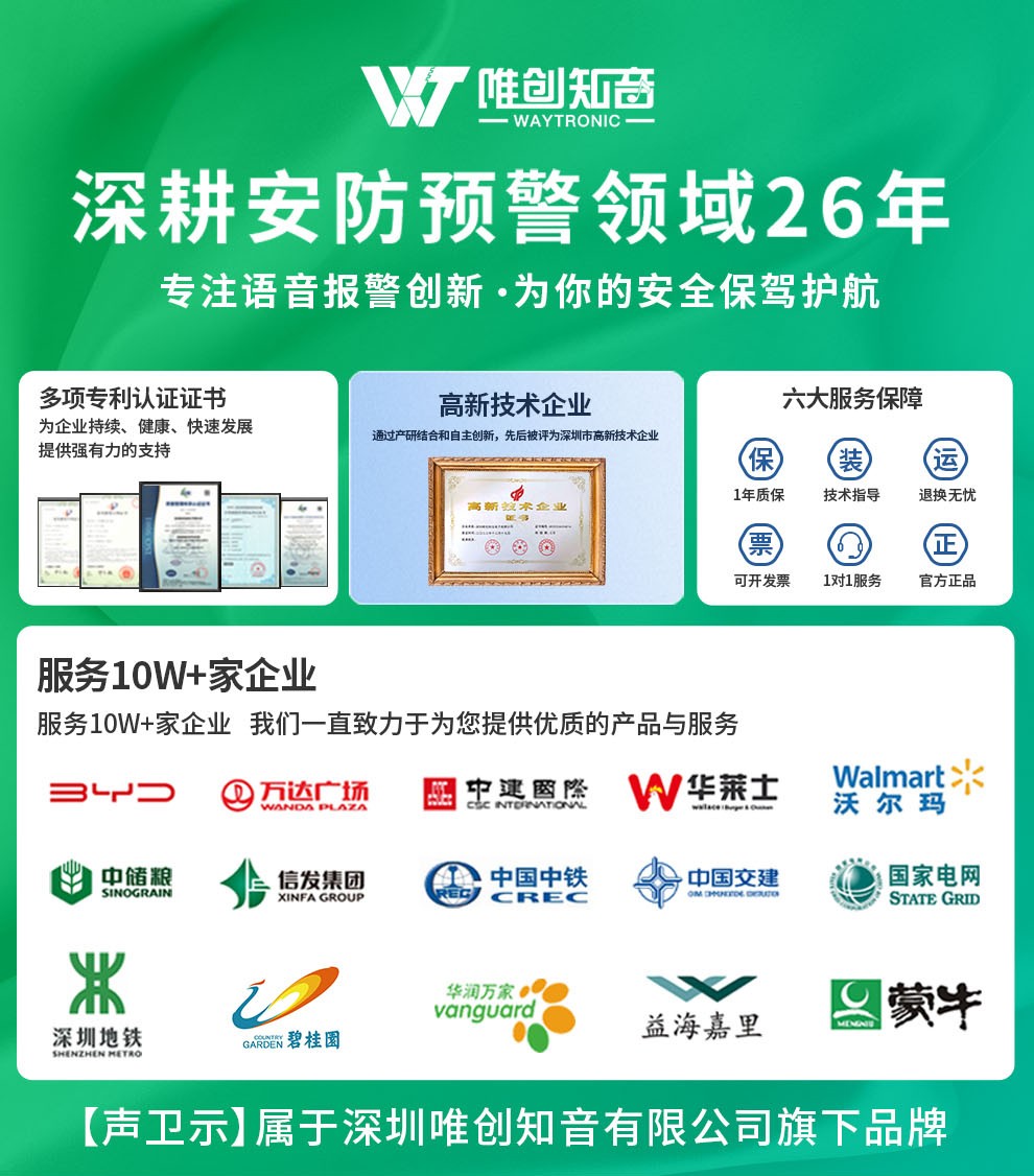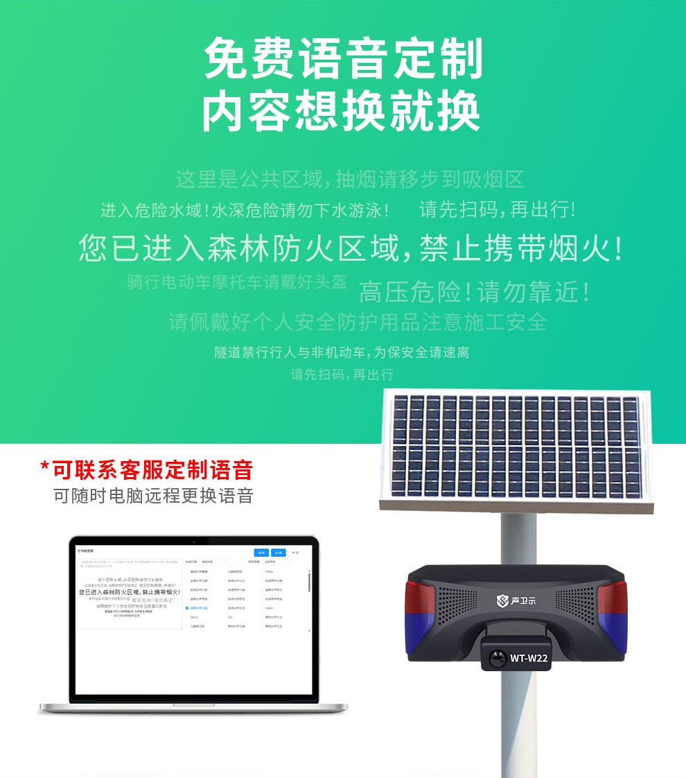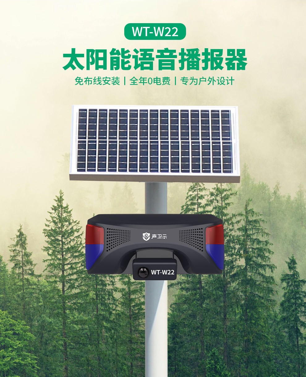 聲衛(wèi)示W(wǎng)T-W22交通安全太陽能語音宣傳桿,專為城鄉(xiāng)道路、街道入口卡口、高速路口等交通安全關(guān)鍵位置設(shè)計。設(shè)備采用紅外感應(yīng)技術(shù)(感應(yīng)距離0-8米),有效探測過往車輛與行人。當(dāng)檢測到目標(biāo)進(jìn)入感應(yīng)范圍,設(shè)備立即啟動115分貝高響度語音警示播報(如“注意安全,減速慢行”、“請遵守交通規(guī)則”等)并同步激活強(qiáng)效聲光警示系統(tǒng),通過醒目視覺提示與清晰語音提醒,及時警示交通參與者注意風(fēng)險。支持插電、充電與太陽能三模供電,具備高度供電靈活性,尤其適合無市電區(qū)域部署。達(dá)到IPX5防水防塵等級,可有效抵御雨水沖刷及日?;覊m侵襲,確保在-20℃至60℃ 的寬溫環(huán)境內(nèi)穩(wěn)定工作。本設(shè)備集智能探測、語音宣傳、聲光警示于一體,提供可靠的道路安全預(yù)警,輔助提升公眾安全意識,降低事故風(fēng)險,是交通節(jié)點全天候安全守護(hù)的實用裝備。