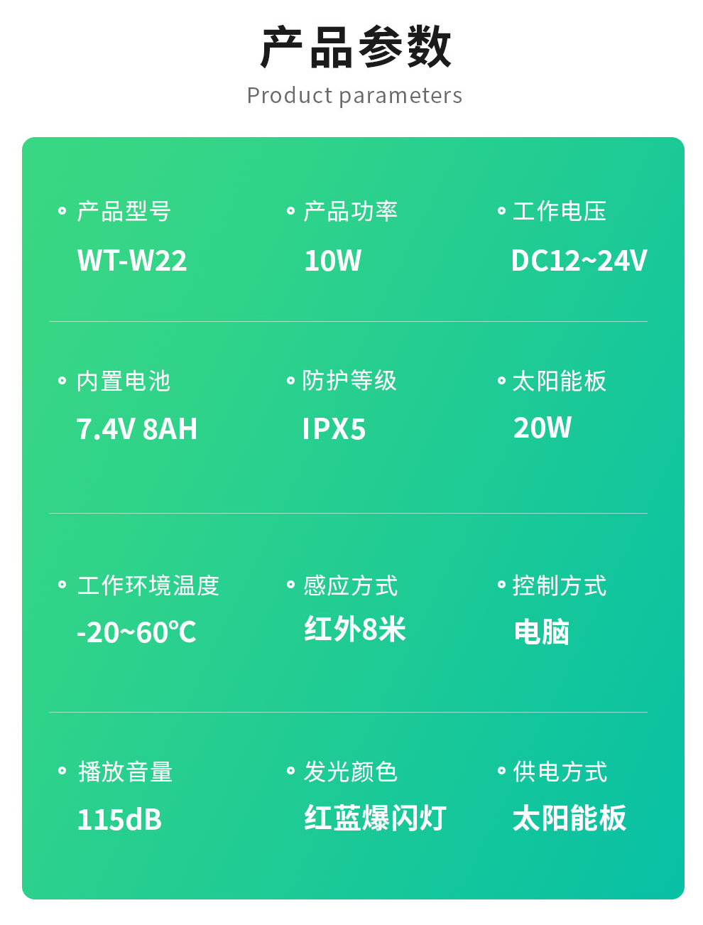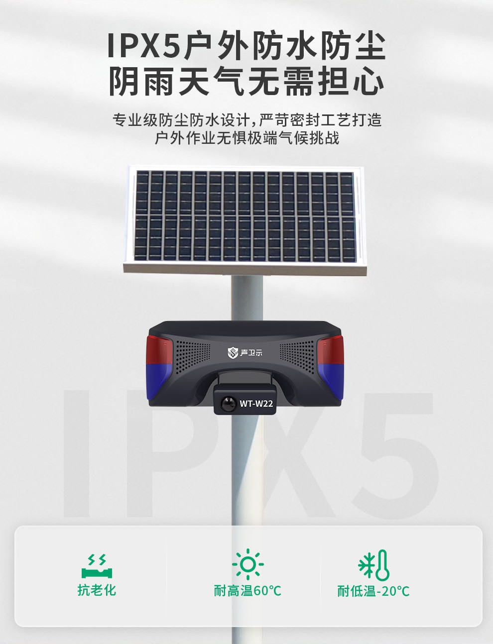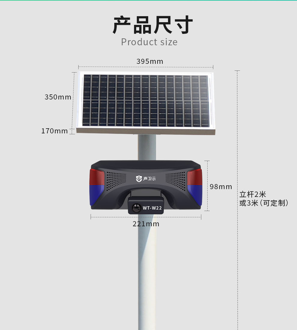 聲衛(wèi)示W(wǎng)T-W22交通安全太陽能語音宣傳桿,專為城鄉(xiāng)道路、街道入口卡口、高速路口等交通安全關(guān)鍵位置設(shè)計。設(shè)備采用紅外感應(yīng)技術(shù)(感應(yīng)距離0-8米),有效探測過往車輛與行人。當(dāng)檢測到目標(biāo)進(jìn)入感應(yīng)范圍,設(shè)備立即啟動115分貝高響度語音警示播報(如“注意安全,減速慢行”、“請遵守交通規(guī)則”等)并同步激活強(qiáng)效聲光警示系統(tǒng),通過醒目視覺提示與清晰語音提醒,及時警示交通參與者注意風(fēng)險。支持插電、充電與太陽能三模供電,具備高度供電靈活性,尤其適合無市電區(qū)域部署。達(dá)到IPX5防水防塵等級,可有效抵御雨水沖刷及日?;覊m侵襲,確保在-20℃至60℃ 的寬溫環(huán)境內(nèi)穩(wěn)定工作。本設(shè)備集智能探測、語音宣傳、聲光警示于一體,提供可靠的道路安全預(yù)警,輔助提升公眾安全意識,降低事故風(fēng)險,是交通節(jié)點全天候安全守護(hù)的實用裝備。