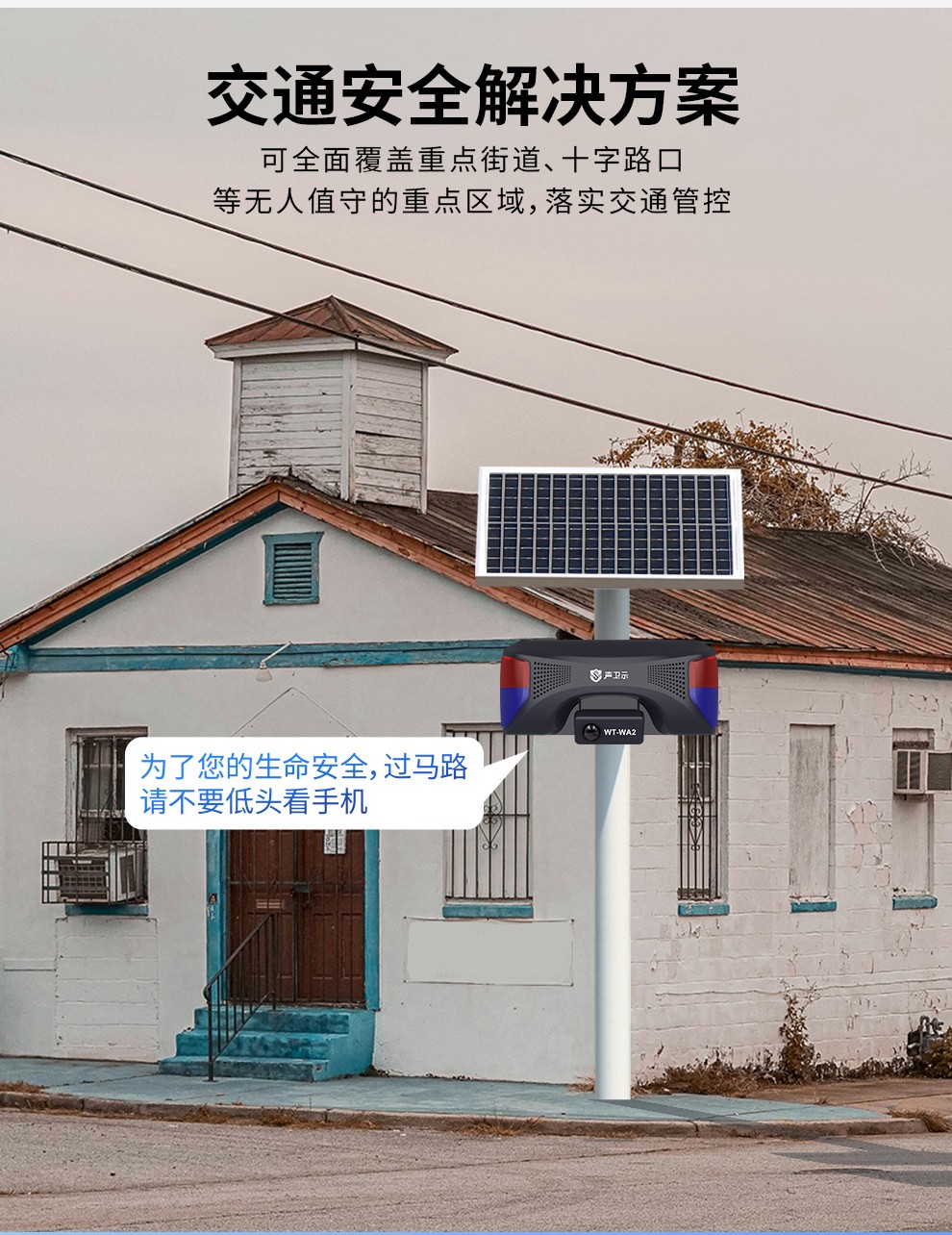 聲衛(wèi)示 WT-WA2 交通安全太陽能語音播放桿,專為城鄉(xiāng)道路、街道入口卡口、高速路口等關(guān)鍵交通節(jié)點(diǎn)設(shè)計。設(shè)備采用紅外+微波雙模感應(yīng)技術(shù)(紅外8米/微波10米),精準(zhǔn)探測車輛與行人通行。當(dāng)檢測到目標(biāo),設(shè)備即刻觸發(fā)115分貝高響度語音播報并啟動強(qiáng)效聲光警示系統(tǒng),及時提醒注意安全(如“請勿闖紅燈”、“注意來車”等)。支持通過手機(jī)APP進(jìn)行遠(yuǎn)程管理及自定義更換警示語音內(nèi)容,滿足多樣化警示需求。提供插電、充電與太陽能三模供電,靈活適應(yīng)各類安裝環(huán)境,尤其保障無市電區(qū)域穩(wěn)定運(yùn)行。具備IPX5基礎(chǔ)防水防塵能力,可抵御日常雨淋,在-20℃至60℃ 寬溫環(huán)境下可靠工作。本設(shè)備集智能探測、可定制語音警示、聲光提示與遠(yuǎn)程管理于一體,有效提升交通節(jié)點(diǎn)安全預(yù)警能力,輔助降低事故風(fēng)險,是智慧化交通管理的實(shí)用裝備。