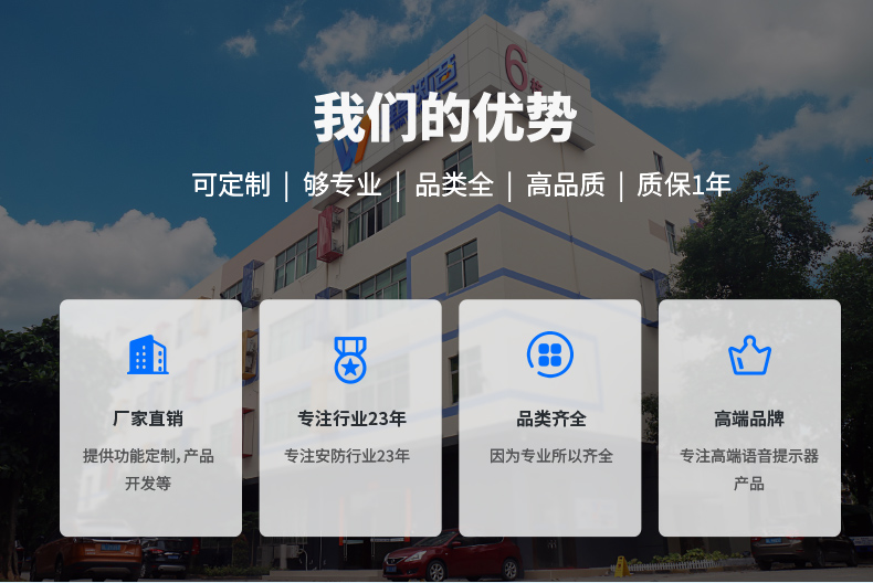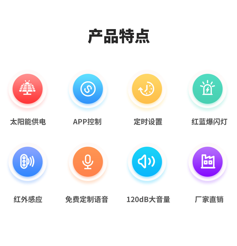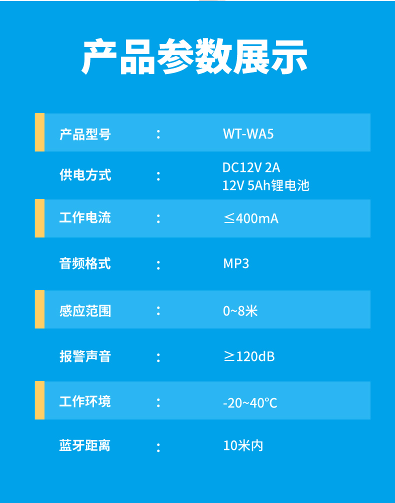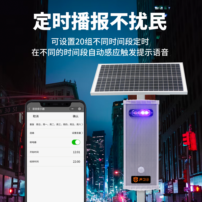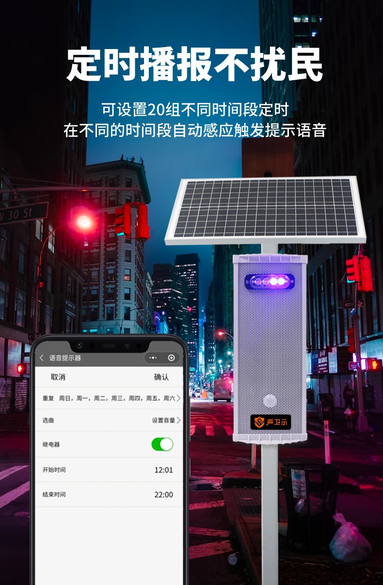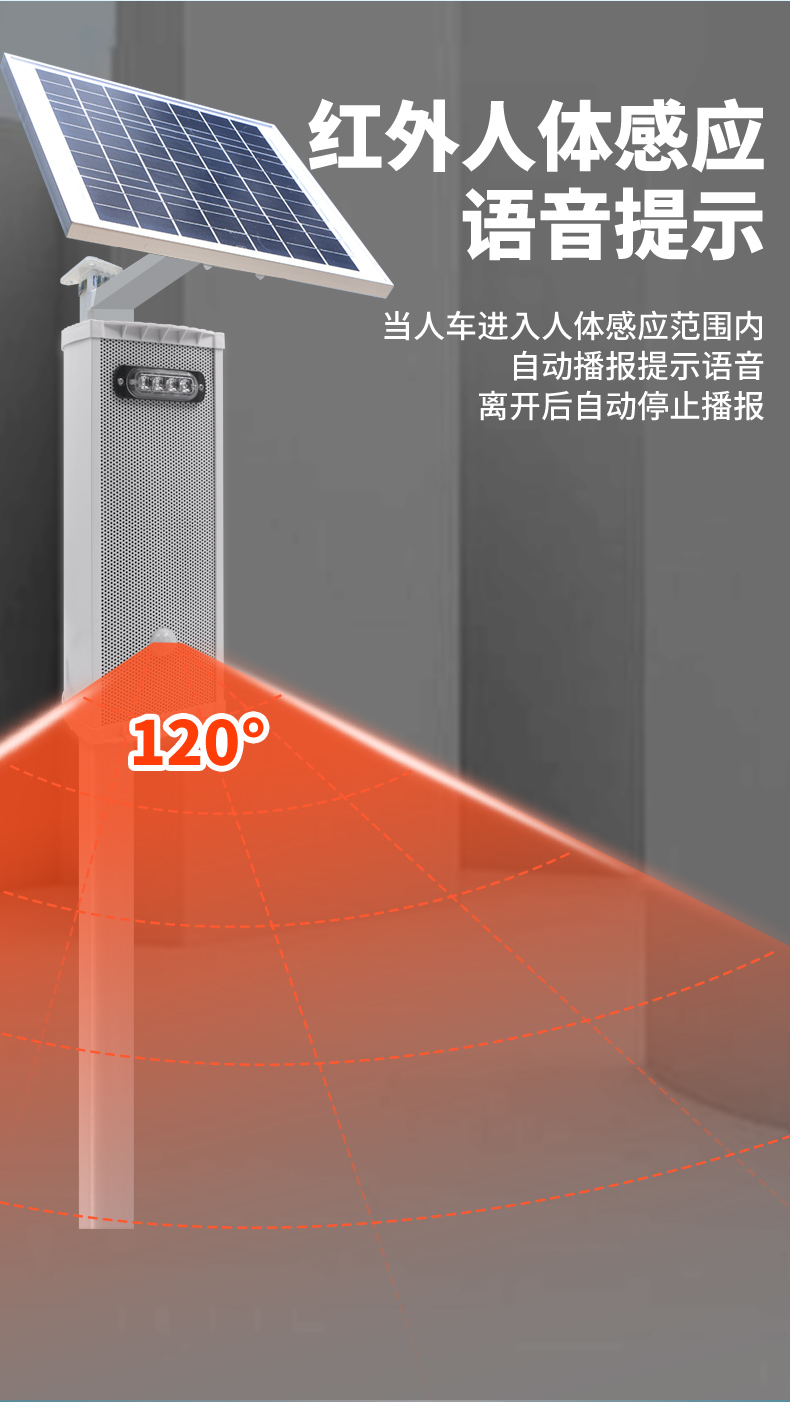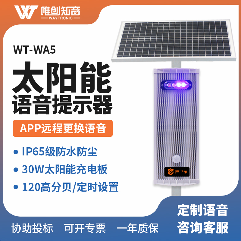WT-WA5是WT-WS5升級款,是我司最新研發(fā)的一款戶外太陽能語音提示器,采用紅外熱釋電人體感應技術(shù),當人經(jīng)過感應區(qū)域時,會立即觸發(fā)播報語音。支持遙控音量調(diào)節(jié)、選曲等功能;操作簡單方便,可通過APP或微信小程序設置定時,更換語音等功能。